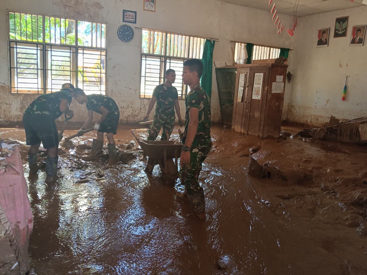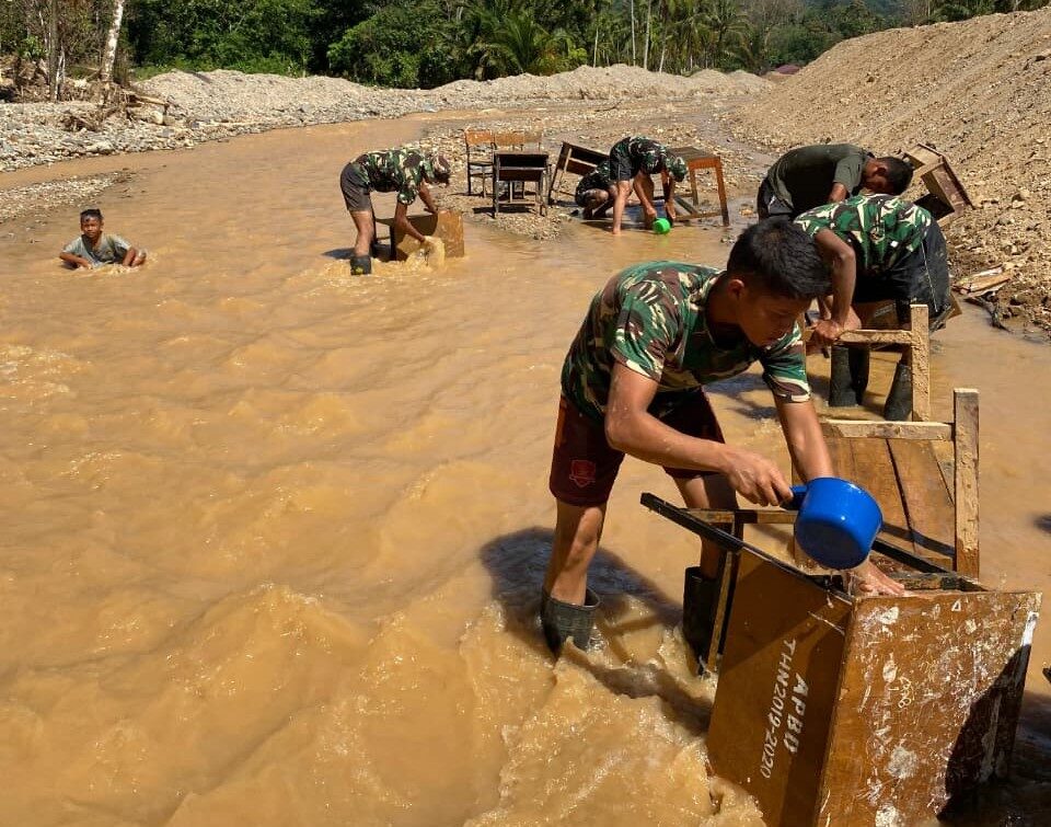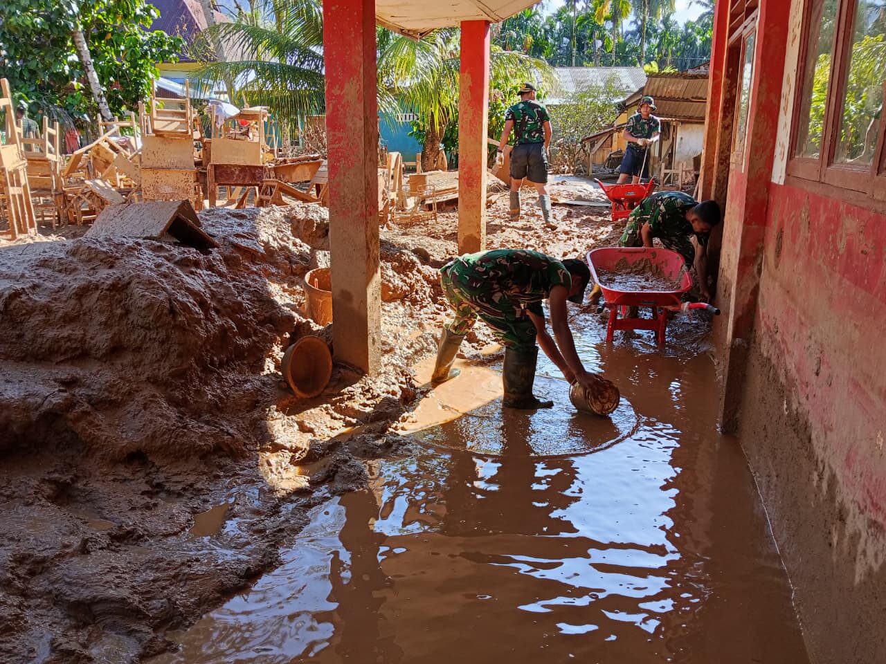 Personel Kodim 0211/Tapanuli Tengah bersama personel Yon TP dikerahkan untuk membersihkan lumpur, perabot sekolah, serta memperbaiki bagian bangunan yang terdampak, termasuk pembuatan pondasi dinding pembatas dan pemasangan batako. Seluruh pekerjaan dilakukan secara gotong royong menggunakan peralatan manual.