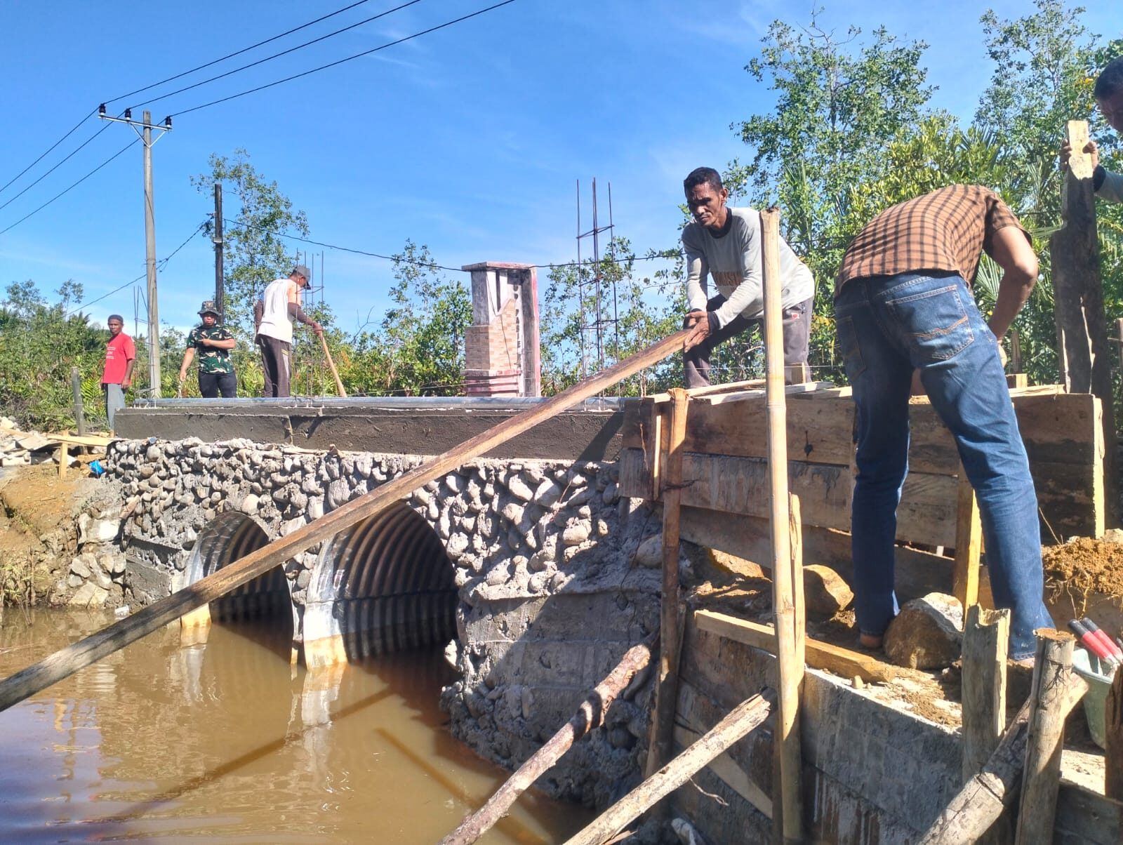 Di Desa Pasi Rasian, pembangunan telah memasuki tahap pemasangan tapak kepala jembatan sebagai bagian penting dari struktur utama, setelah sebelumnya dilakukan pengecoran badan jembatan. Tahapan ini menjadi krusial untuk memastikan kekuatan konstruksi sebelum dilanjutkan ke proses berikutnya.