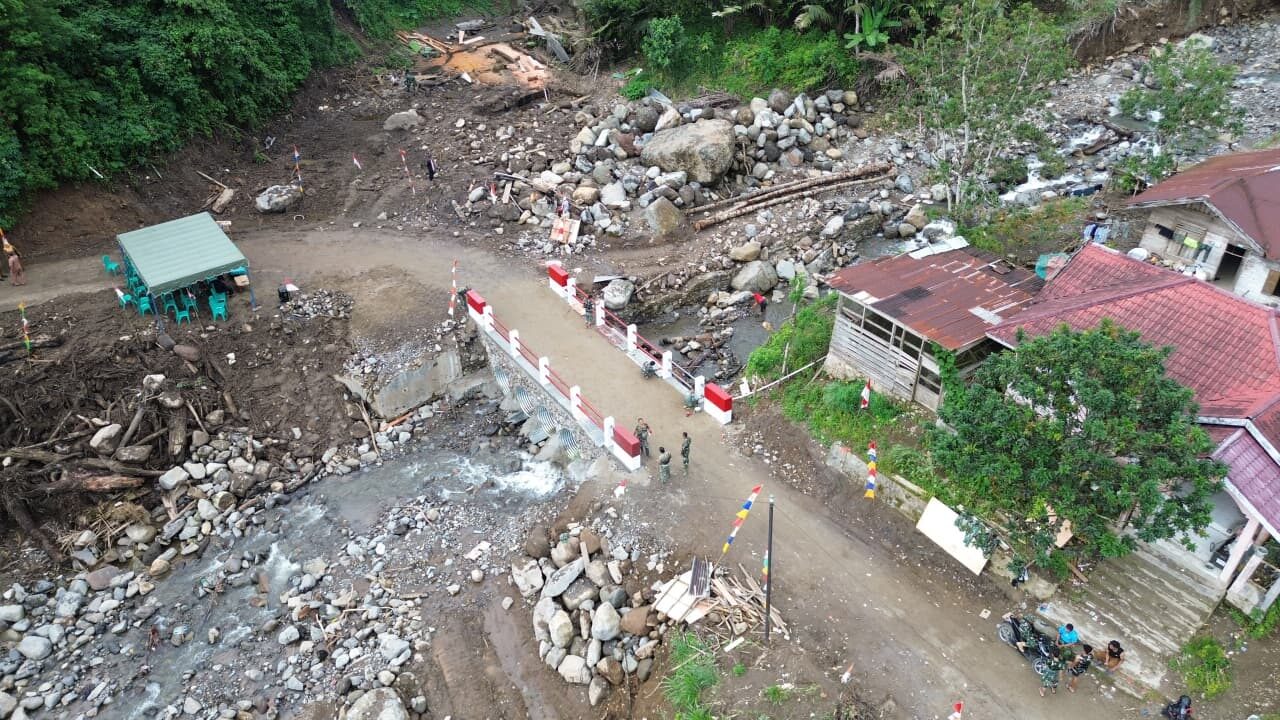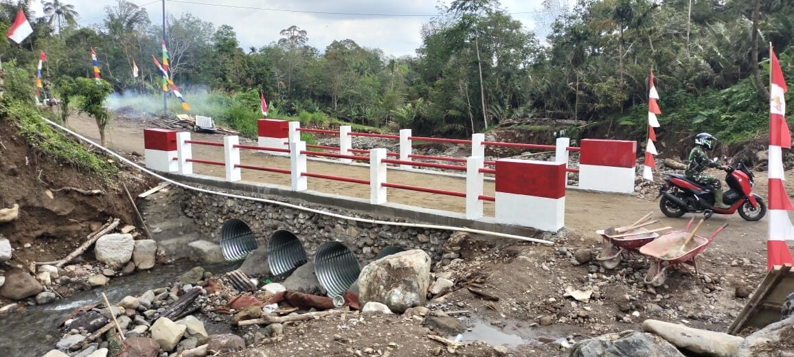 Padangsidimpuan, tniad.mil.id – Satgas Yonzipur I/DD bersama Zidam I/Bukit Barisan dan personel Kodim 0212/Tapanuli Selatan merampungkan pembangunan Jembatan Aramco Aek Sibontor Lubuk Raya di Lingkungan IV, Kelurahan Lubuk Raya, Kecamatan Padangsidimpuan Hutaimbaru, Kota Padangsidimpuan, Senin (12/1/2026).